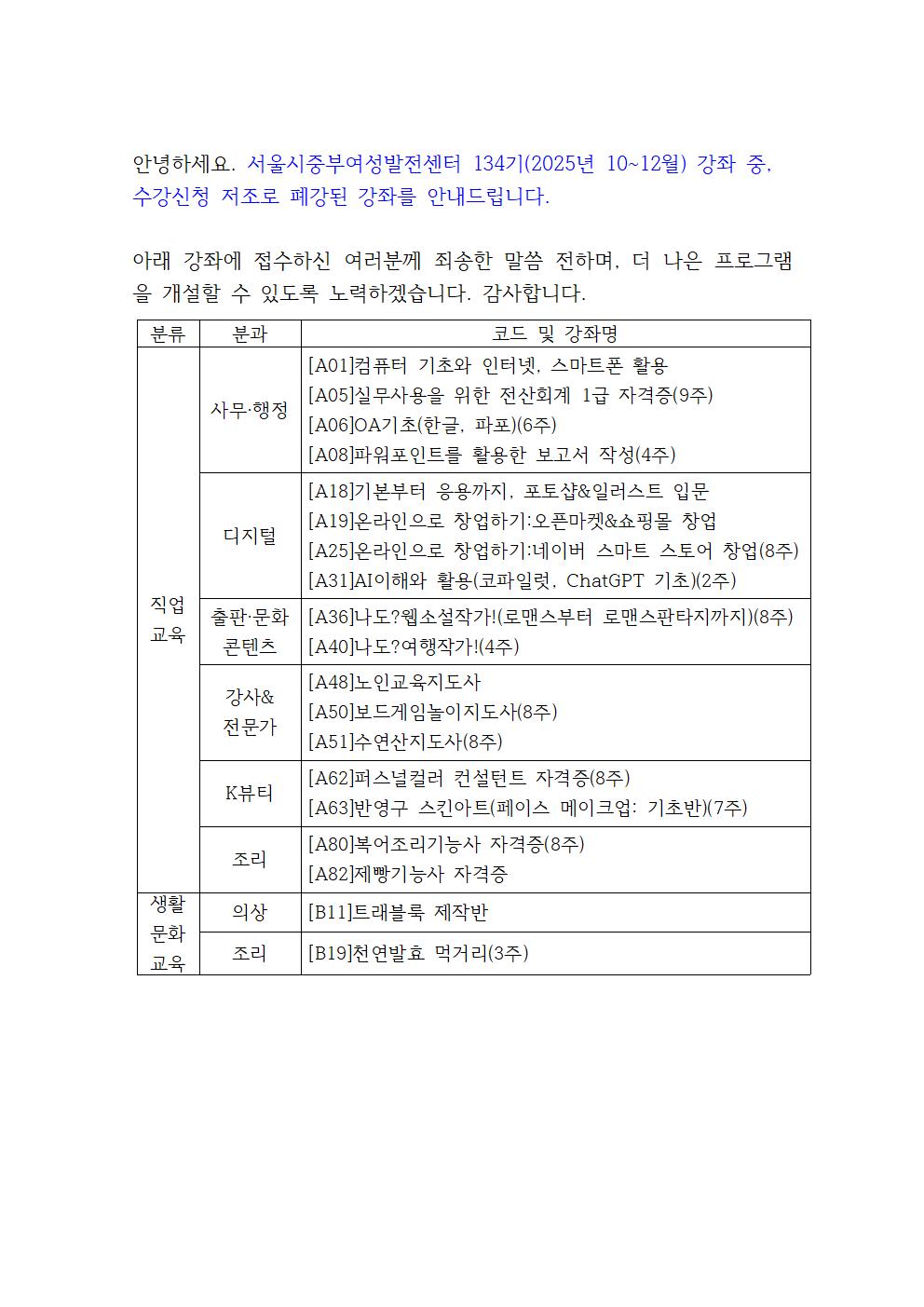 [공지]134기(2025년 10~12월) 폐강과목 안내