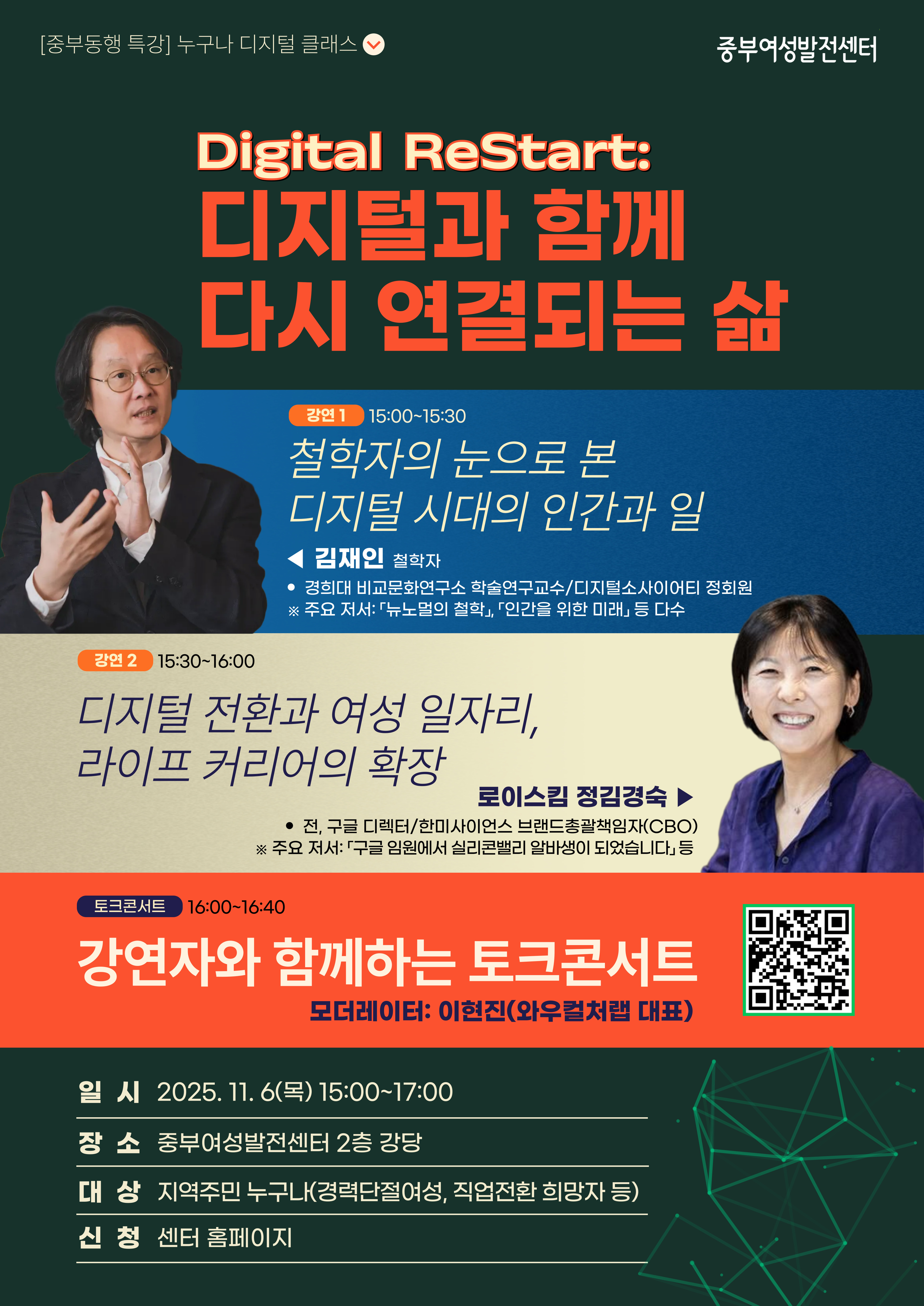 서울시중부여성발전센터에서 가속화 되고 있는 디지털 경제 전환과 AI, 자동화 등 기술변화로 발생하는 새로운 일자리 지형 인식을 위한 “Digital ReStart : 디지털과 함께 다시 연결되는 삶” 무료 특강을 진행합니다.