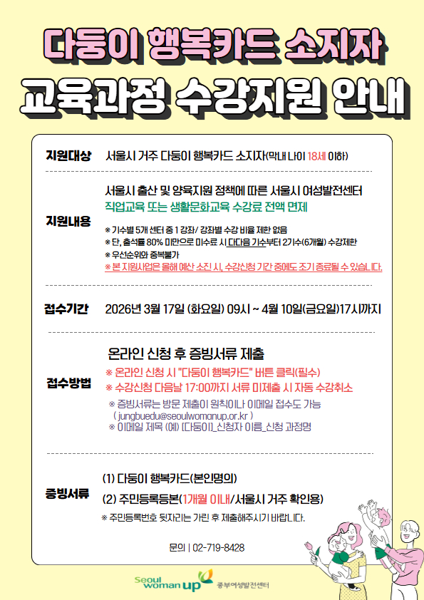 서울시 출산 및 양육지원 정책에 따라 [다둥이 행복카드 소지자 교육비 면제] 혜택(이하 ‘다둥이 혜택’)이 2026년에도 계속 운영됩니다.