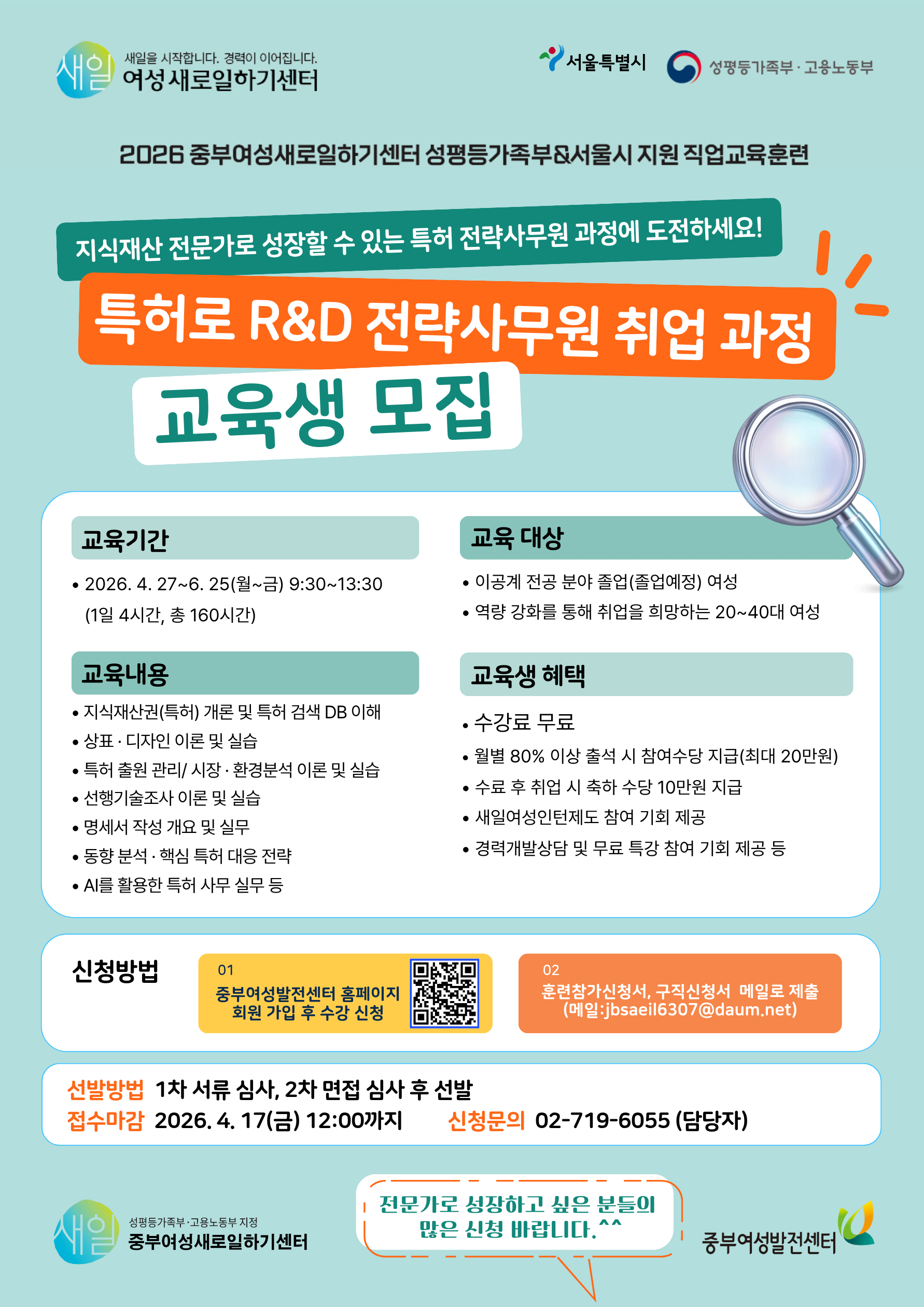 2026년 성평등가족부&서울시 지원 무료 직업교육 '특허로 R&D 전략사무원 취업' 과정 교육생을 모집합니다.