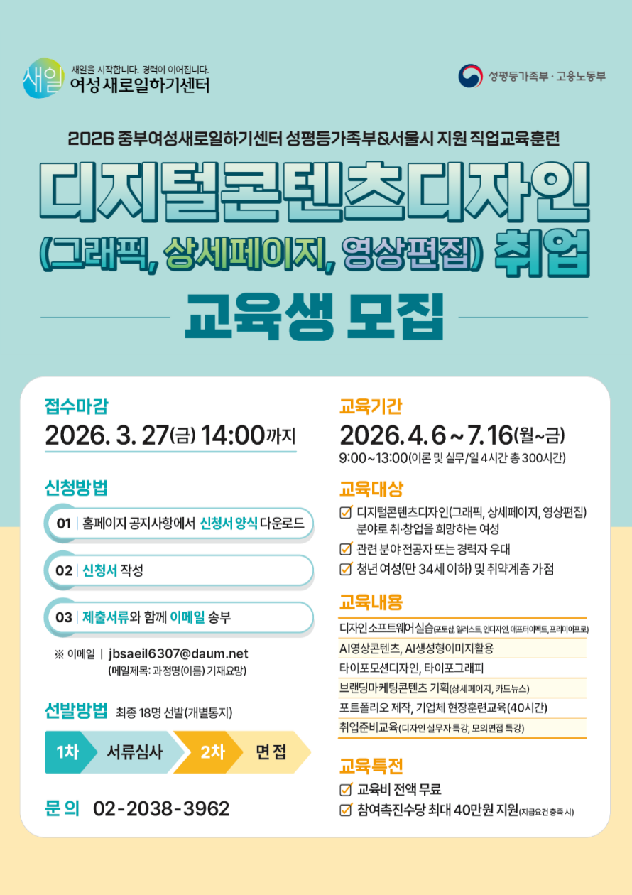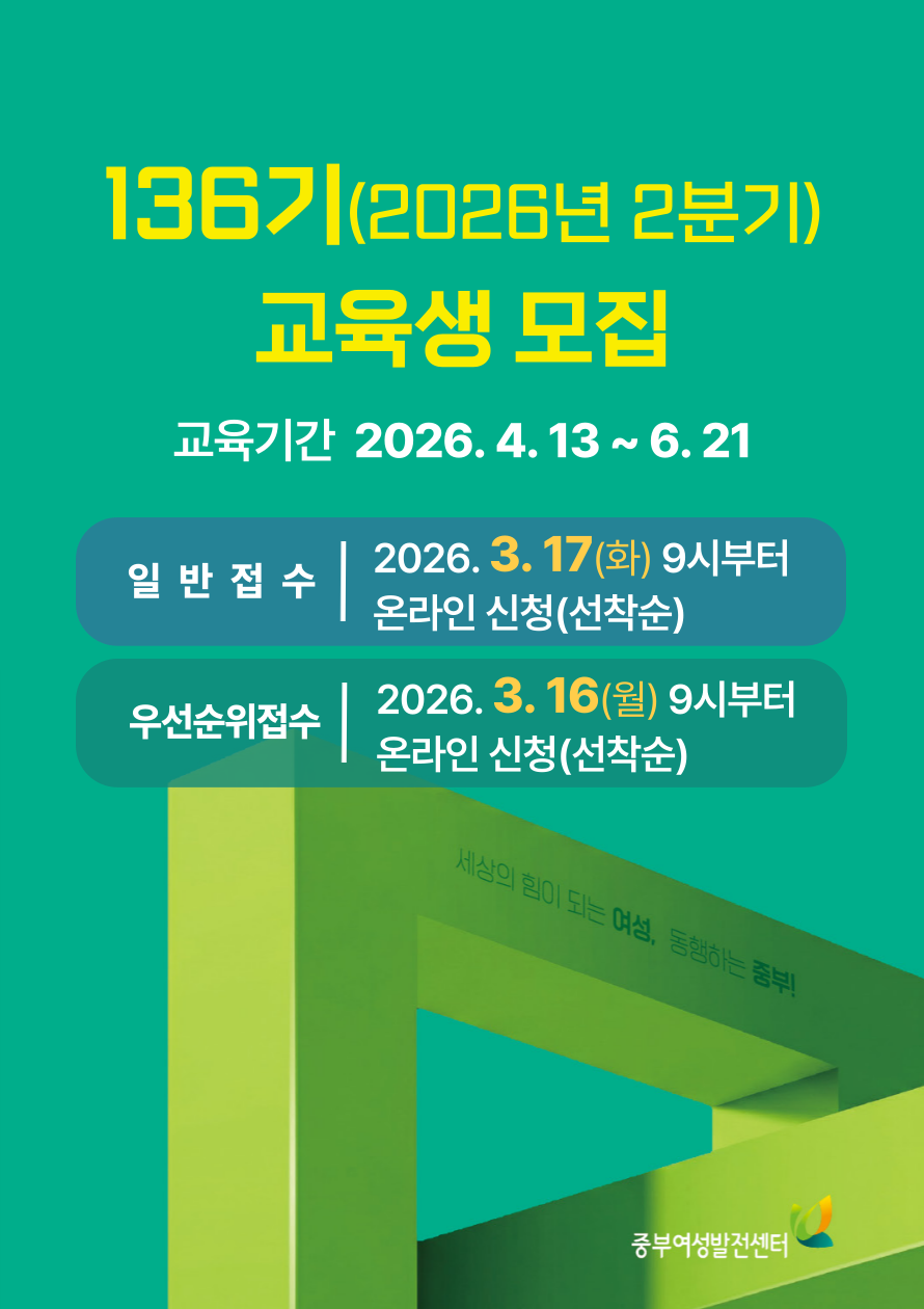 다중 게시판 공지사항 [무료직업교육훈련] 특허로 R&D 전략사무원 취업 과정 교육생 모집 [공지]135기 만족도 조사 참여 경품 당첨자 명단 [1차 모집] 2026년 서울커리업 구직지원금 참여자 모집 [직원채용 공고] 중부여성발전센터 취창업팀(직업상담사) 1명 [안내] 서정대학교 평생교육원 민간자격과정(무료교육/ 온라인LMS) 안내 특강안내 [2026 경단예방-직장인 역량 강화 특강] '실무에 꼭 필요한 엑셀 기본' '실무에 꼭 필요한 엑셀 고급 활용하기' [2026 경단예방-직장인 역량 강화 특강] '품격을 높이는 비즈니스 매너' '나의 권리를 지키는 최신 노동법 특강' [무료특강] 2026년 한살림 가사관리사 양성교육 [2025 경단예방-직장인 역량 강화 특강] '엑셀 기본 함수와 데이터 분석 및 관리'&'인사 담당자를 위한 필수 노동법' [2025 경단예방-직장인 역량 강화 특강] '슬기로운 직장인의 대화 수업' 채용정보 [소나무노인방문요양센터] 요양보호사 [두례노인요양보호센터] 요양보호사 [가나재가복지센터] 요양보호사 [노원실버사랑간호요양센터] 요양보호사 [만세방문요양센터] 요양보호사 더보기