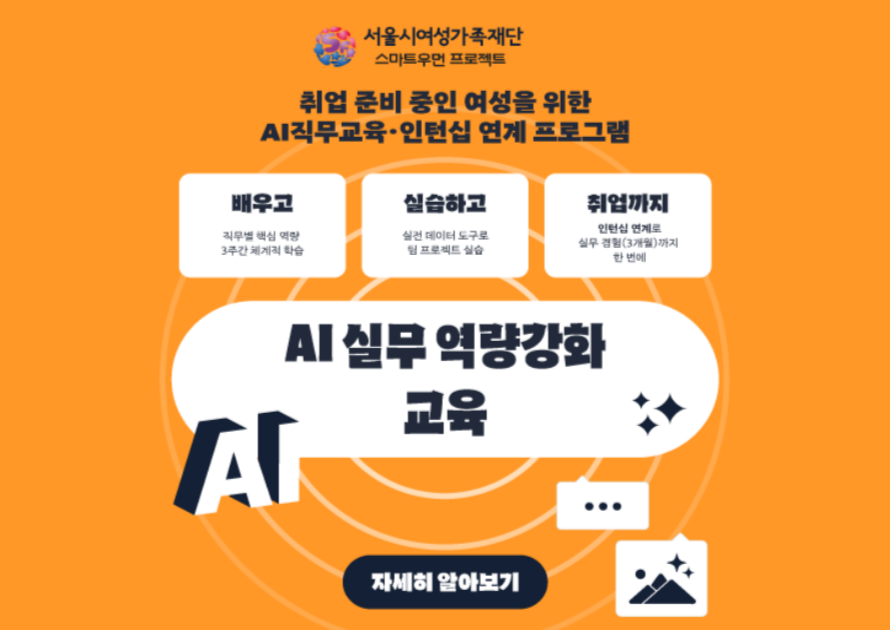 다중 게시판 공지사항 [안내] 다둥이 행복카드 소지자 교육비 면제 안내 [안내] 136기(2026년 4~6월) 교육생 모집 안내 [공지] 매월 첫째주, 셋째주 화요일 무료 노동상담! [공지] 135기[1~3월] 사물함 열쇠반납 및 136기[4~6월] 연장신청 안내 [모집(서울시여성능력개발원 주최)]「AI 실무 역량강화 교육」 참여자 모집(무료교육) 특강안내 [2026 경단예방-직장인 역량 강화 특강] '실무에 꼭 필요한 엑셀 기본' '실무에 꼭 필요한 엑셀 고급 활용하기' [2026 경단예방-직장인 역량 강화 특강] '품격을 높이는 비즈니스 매너' '나의 권리를 지키는 최신 노동법 특강' [무료특강] 2026년 한살림 가사관리사 양성교육 [2025 경단예방-직장인 역량 강화 특강] '엑셀 기본 함수와 데이터 분석 및 관리'&'인사 담당자를 위한 필수 노동법' [2025 경단예방-직장인 역량 강화 특강] '슬기로운 직장인의 대화 수업' 채용정보 [아현어린이집] 조리사 [키즈랜드 어린이집] 조리사 [엔젤복지센터] 요양보호사 [엔젤복지센터] 요양보호사 [주식회사 디옵티멀그린] 기타 사무직 더보기